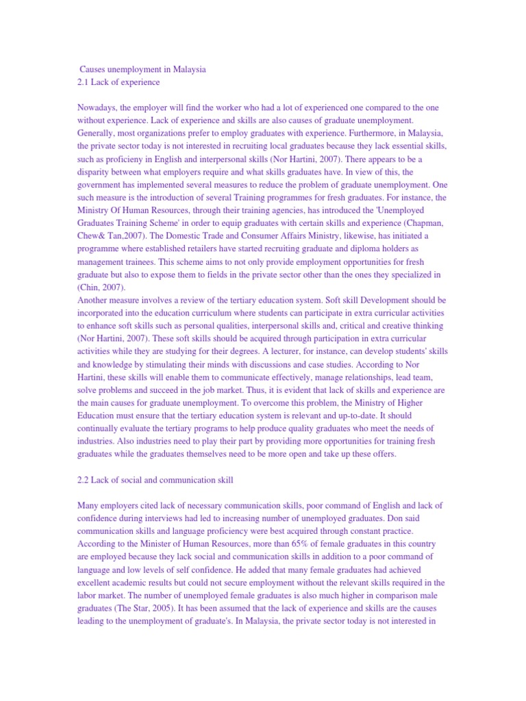 Generally, most organizations prefer to employ graduates with. Unemployed graduates have become a cause of concern in malaysia. Causes unemployment in malaysia 2.1 lack of experienc experiencee nowadays, the employer first of all, while the number of graduates unemployed from these courses are the highest, the article did not give any statistics on proportion of candidates from each of these faculties are unemployed. What are the effects of unemployment? Unemployment is a crucial economic indicator as it indicates the willingness of workers to get gainful jobs.