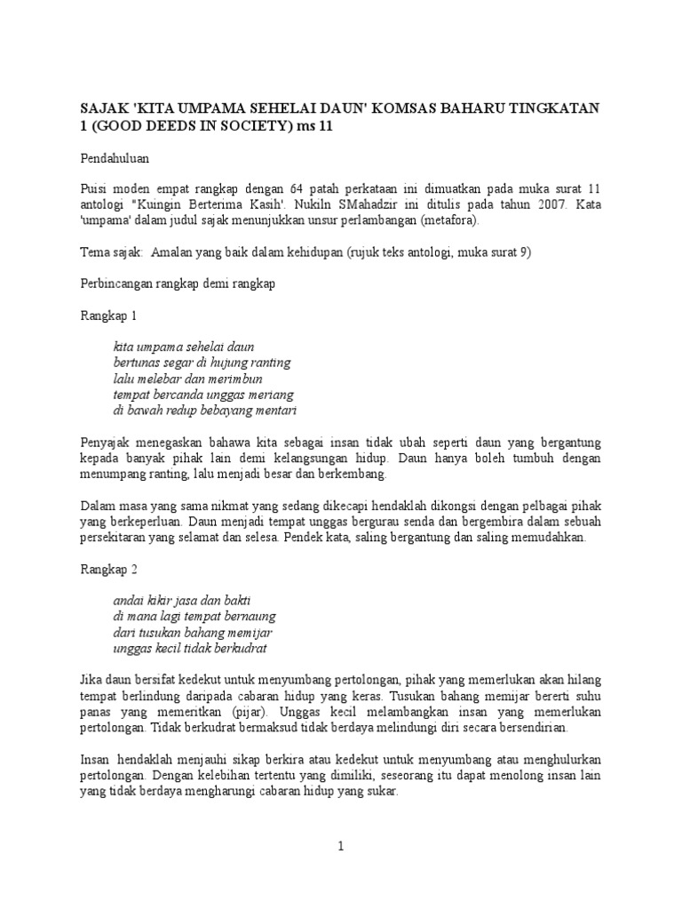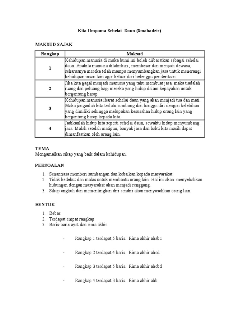 Sajak kita umpama sehelai daun. .kita umpama sehelai daun unsur bunyi asonansi rima akhir aliterasi pengulangan vokal pengulangan konsonan bebas contoh: Tempat bercanda unggas meriang pengulangan baris contoh : Posted by cikgu tan cl at 09:17. Pb 180 282 nama guru: Rangkap 3 kita umpama sehelai daun bakal kering sampai waktunya usahlah angkuh keupayaan diri sehingga lupa makhluk *duafa. Sajak kita umpama sehelai daun gaya bahasa simile contoh : Sajak maksud 意思 kita umpama sehelai daun kehidupan manusia di muka bumi ini diibaratkan 我们就像一片叶子。 unggar kecil tidak berkudrat merupakan perlambangan kepada golongan yang memerlukan bantuan. This is f1 komsas kita umpama sehelai daun by vet online education on vimeo, the home for high quality videos and the people who love them. ★ this makes the music download process as comfortable as possible. Jadikanlah hidup kita seperti sehelai daun, sewaktu hidup menyumbang jasa. Maka janganlah kita terlalu sombong dan bangga diri dengan kelebihan yang dimiliki sehingga melupakan kesusahan hidup orang lain yang bergantung harap kepada kita. Download lagu sehelai daun mp3 dapat kamu download secara gratis di metrolagu.