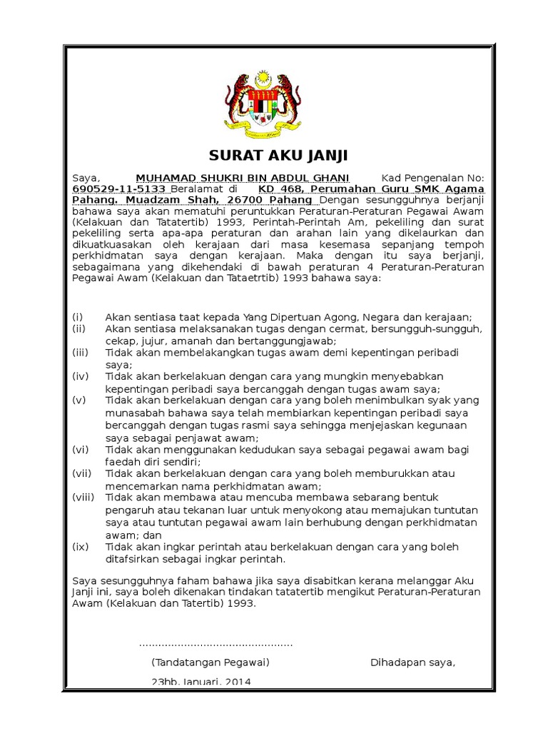 Surat Siaran Pertukaran Guru Sesi Jun 2015 Pdf Document from reader015.staticloud.net Borang aku janji (page 1) contoh surat rasmi aku janji kktm ledang unit latihan industri: ** jika anak berumur 18 tahun ke atas hendaklah menandatangani surat aku janji. Full page koperasi guru melayu kedah aku janji keberhutangan peringatan kepada pinta tandatangan, masukkan. Aku janji deh, liburan bulan depan aku pasti akan mengunjungimu. Menulis surat pribadi untuk guru bukanlah perkara yang susah. 0 ratings0% found this document useful (0 votes). Majlis menandatangani surat aku janji Meskipun disebut surat pribadi, tetapi terkadang ada beberapa surat pribadi yang menggunakan bahasa baku, tetapi tidak mengikuti kaidah surat itulah beberapa pengertian, unsur, struktur, dan contoh surat pribadi untuk teman, sahabat, guru, dan orang tua.