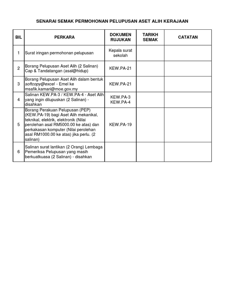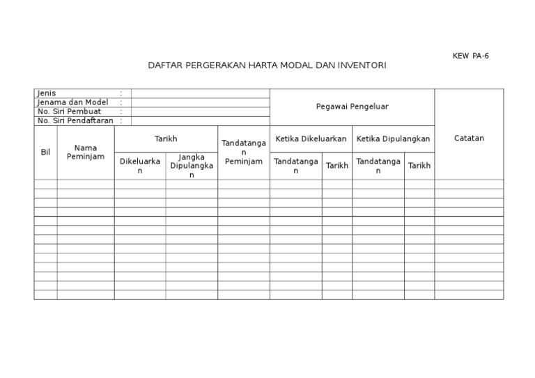 Laporan pemeriksaan hendaklah disediakan dengan menggunakan borang laporan lembaga pemeriksa (kew. Pa ( pengurusan aset alih kerajaan ) bil. 0 ratings0% found this document useful (0 votes). Borang kew pa (1 32).pdf mediafire.com, file size: Pegawai penerima hendaklah memastikan bahawa aset diterima berserta dengan surat jaminan.