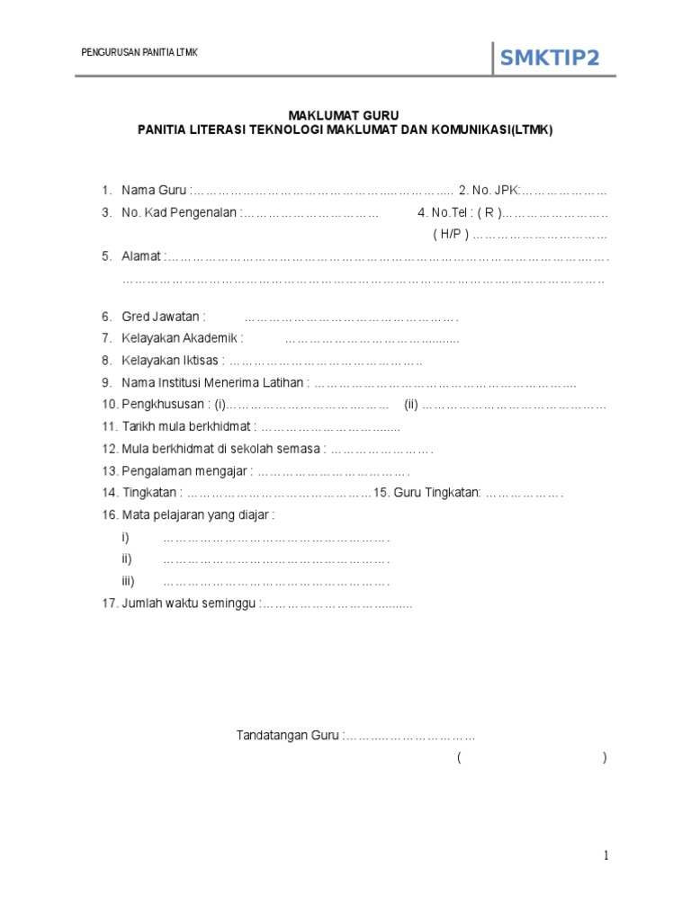 Borang Maklumat Guru Spsk English 2016 Doc Document from cdn.vdokumen.net Borang kehadiran surat sakit, suratmahkamah, dll 2. .tanggungjawab pengurus, guru penolong kanan, guru disiplin, guru panitia, guru kokurikulum, guru darjah, guru mata pelajaran, guru tugas khas & tugas staf sokongan. Berdasarkan kamus dewan edisi keempat, panitia bermaksud jawatankuasa: Maklumat sumber industri (hris) yang mengemukakan tentang factor kejayaan hris. ** kemas kini maklumat setiap anak dengan klik pada nama anak. Boleh diubah sekiranya ada maklumat yang tidak lengkap, sila serahkan lampiran a4 kepada guru berkenaan. Cara mudah buat borang maklumat peribadi pelatih | how to create personal information form. Sila isi satu borang untuk satu panitia.