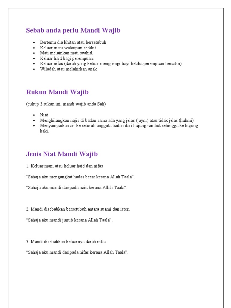Mandi Wajib Tahun 4 from image.slidesharecdn.com Niat mandi wajib, pelaksanaannya bukan sekedar pelafalan saja. Terjadi peluruhan pada dinding rahim yang dipengaruhi juga oleh hormon progesteron. Melakukan niat mandi wajib adalah hal yang sudah seharusnya dilakukan bagi mereka yang sudah berpasangan dan telah melakukan hubungan suami istri. Bersetubuh (berjimak) samada keluar air mani ataupun tidak. Simak doa mandi junub berikut ini. Penjelasan tentang pengertian mandi wajib, tata cara, rukun, sunnah, niat & penyebab yang dijelaskan oleh seputarpengetahuan.co.id dengan mandi wajib merupakan aktivitas mandi yang memakai air suci dan bersih. Mandi wajib nifas vs mandi wajib wiladah; Sahaja aku mandi wajib kerana allah taala. perlukah gabungkan 2 niat mandi wajib?