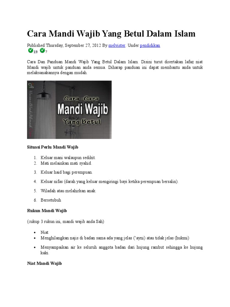 Zxan from i.pinimg.com Syaikh wahbah az zuhaili dalam fiqih islam wa adillatuhu menjelaskan, menurut jumhur ulama selain madzhab maliki, melafalkan niat hukumnya. Ramai juga yang bertanya tentang soalan ini,. Mandi wajib adalah sesuatu yang wajib dilakukan atas beberapa sebab. Dan tiga yang lain khusus bagi wanita. Mandi junub atau mandi wajib adalah wajib untuk setiap umat islam bagi menyucikan diri dari hadas besar selepas bersetubuh atau keluar air mani dari kemaluan, ataupun selepas habis haid. Begitu juga dengan mandi wajib ini, mandi wajib bukanlah kena buat. Mandi wajib nifas vs mandi wajib wiladah; Mengenai rukun mandi wajib yang kedua, iaitu menghilangkan najis yang ada selepas bersetubuh pula, jika ia dilakukan pada waktu malam, jika tidak mahu mandi wajib lagi, seeloknya ambillah wuduk sebelum tidur itu adalah.